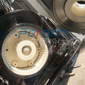 CAM-S雙軸陶瓷粉碎機(jī)工作運(yùn)轉(zhuǎn)中物料由加料系統(tǒng)均勻的送入粉碎室受到高速旋轉(zhuǎn)的粉碎盤的強(qiáng)烈沖擊,同時(shí)受到離心力的作用,與粉碎齒圈發(fā)生碰撞,受到剪切、摩擦、碰撞等多種綜合力的作用,使物料粉碎,被粉碎的物料隨氣流運(yùn)動到分級區(qū),通過變頻調(diào)節(jié)的分級輪,對粗細(xì)物料進(jìn)行分離,符合細(xì)度要求的產(chǎn)品隨氣流進(jìn)入旋風(fēng)收集器和除塵器收集,粗物料返回分級區(qū)二次粉碎。