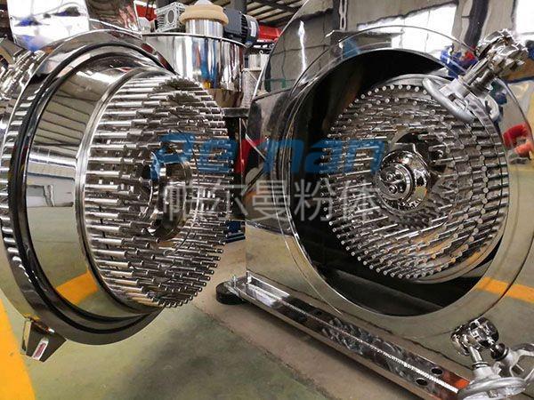 1、棒銷式、敲擊棒式:轉(zhuǎn)子、定子組成封閉粉碎腔。當(dāng)物料經(jīng)加料裝置送入粉碎腔后,在轉(zhuǎn)子高速旋轉(zhuǎn)作用下,物料也跟隨加速旋轉(zhuǎn),同時(shí)在離心力作用下向外周方向運(yùn)動(dòng)。在此過程中,物料與轉(zhuǎn)子及定子上的銷棒之間發(fā)生強(qiáng)烈碰撞而被粉碎,并且越往外粉碎程度越劇烈。由于轉(zhuǎn)子和定子各有3~4層銷棒圈,所以物料的粉碎作用較為充分。棒銷式棒銷較密,適合于超細(xì)粉碎;敲擊棒式棒較少,適合于粗粉碎。